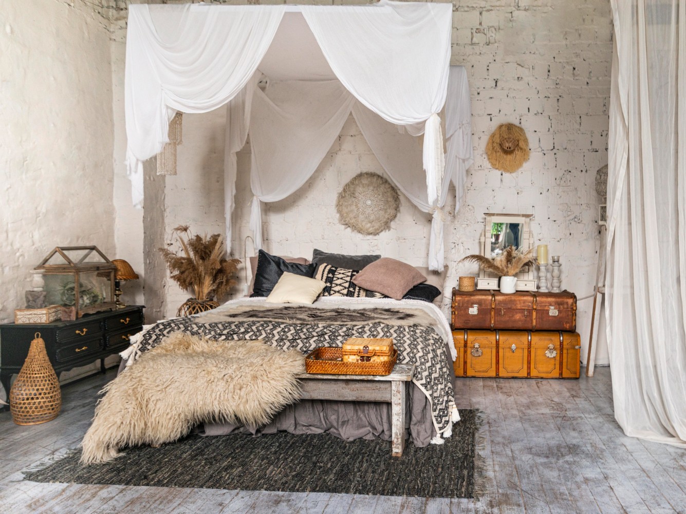 Pour les textiles, les fibres naturelles sont incontournables. Lin, laine cardée, coton texturé ou gaufré, bouclette écrue ou tissu nid d’abeille créent un relief subtil et une ambiance à la fois douce et élégante. Rideaux en lin, tapis en laine, assises en nid d’abeille ou paniers en jute s’intègrent naturellement dans ce décor chaleureux.